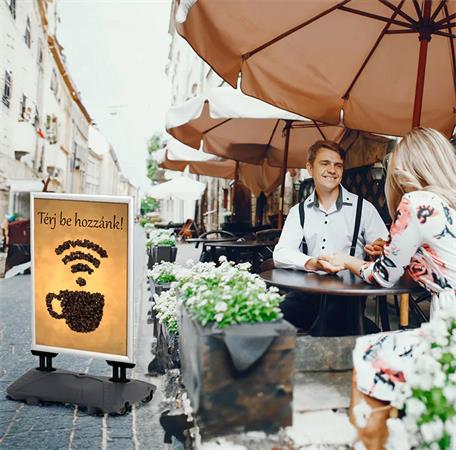 Az A1-es megállítótábla víztartályos talppal ideális kültéri reklámhordozó, amely stabil és figyelemfelkeltő megjelenést biztosít üzletek, rendezvények és parkolók környezetében.